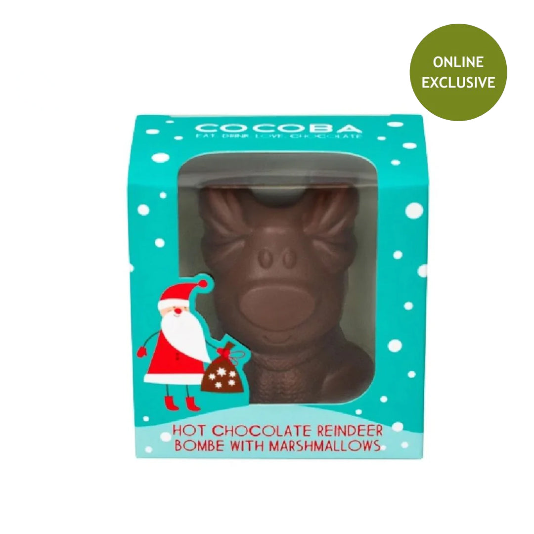 Limited edition Reindeer Hot Chocolate Bombe, made from premium milk chocolate with mini marshmallows hidden inside. A delightful addition to any stocking or as a sweet treat from Secret Santa - perfect when paired with our "I'm a mug for hot chocolate" mug.