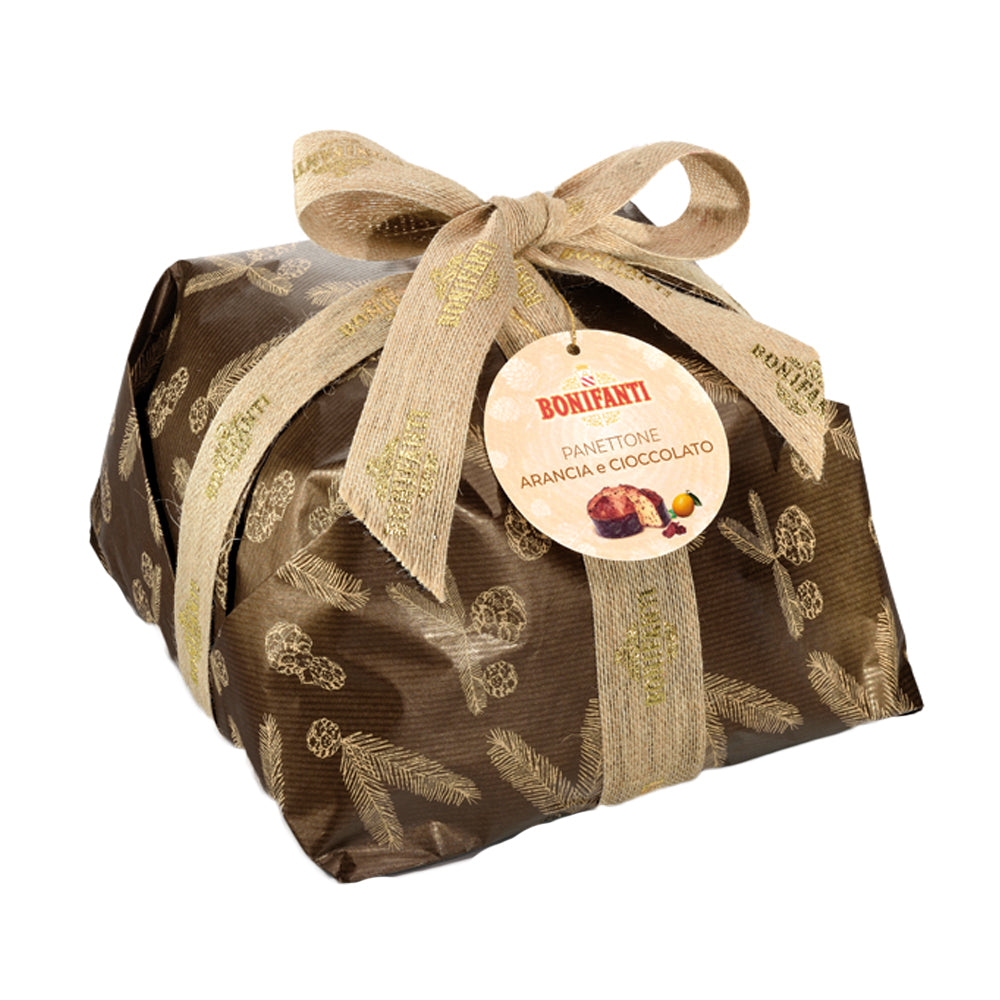 A delicious panettone without glaze where the traditional dough, made with cocoa butter, Madagascar vanilla beans, fresh barn eggs, premium butter and selected flours, meets soft cubes of candied orange peel and delicious dark chocolate chips.