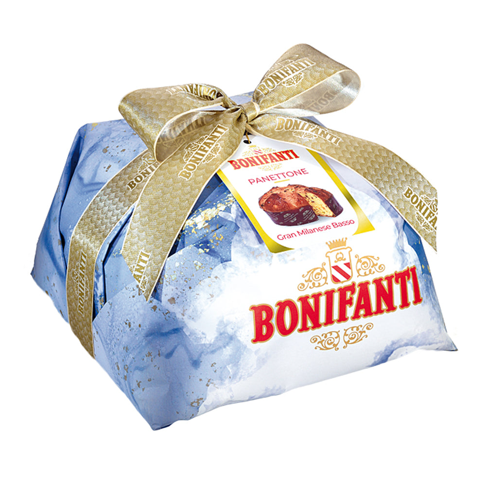 The typical Panettone of Milan, in its Basso (short) variations, glaze-free, and which gathers the tastes and the flavours of the Bonifanti dough, made up of fresh barn eggs, selected flours and a first-choice butter, in a perfect combination with sultana raisin, oranges and citrons crystallized rinds and finished with the softness of cocoa butter and the flavour of the vanilla berries from Madagascar.
