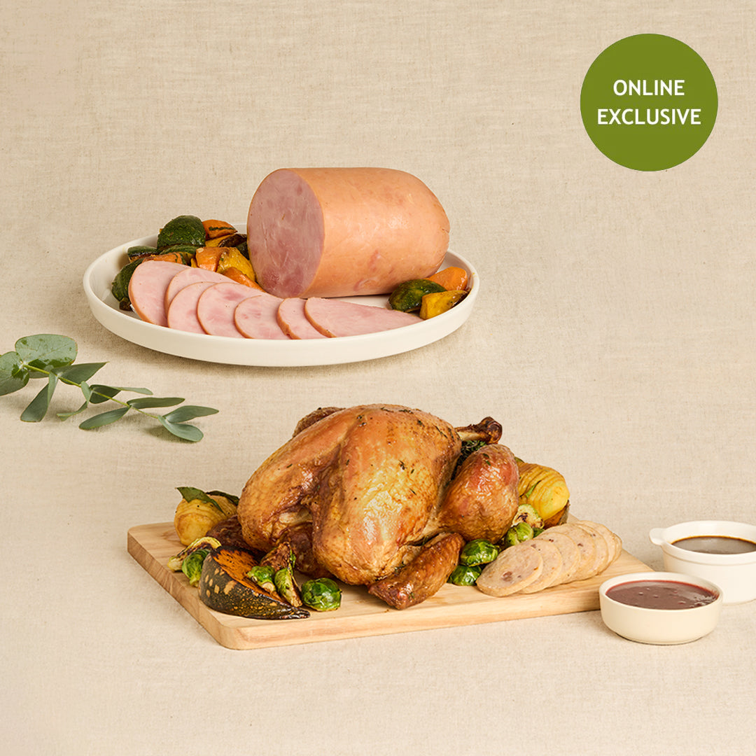Traditional Roasted Turkey With Chestnut Stuffing, Gourmet Sauce And Cranberry Sauce + Mini Smoked Truffle Free Range Ham + Big Cooler Bag