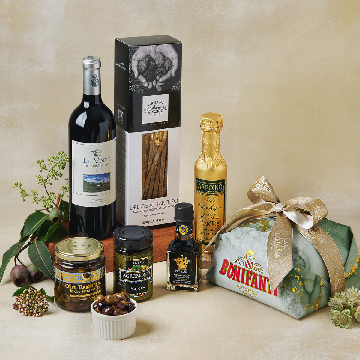 A decadent showcase of Italian excellence, from truffle pasta to pistachio-filled panettone, and a bottle of Le Volte Dell Ornellaia.